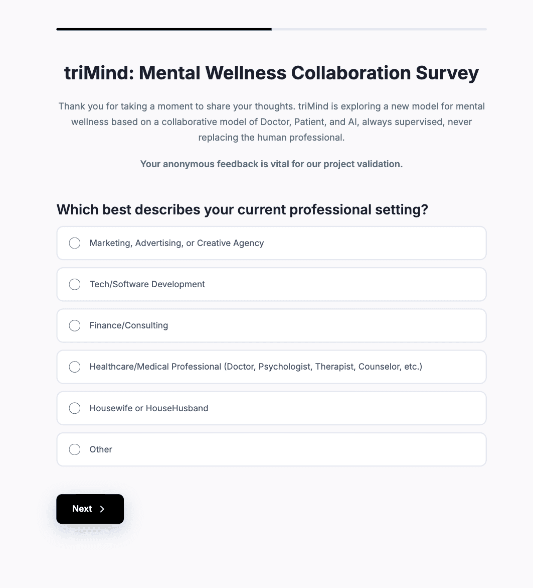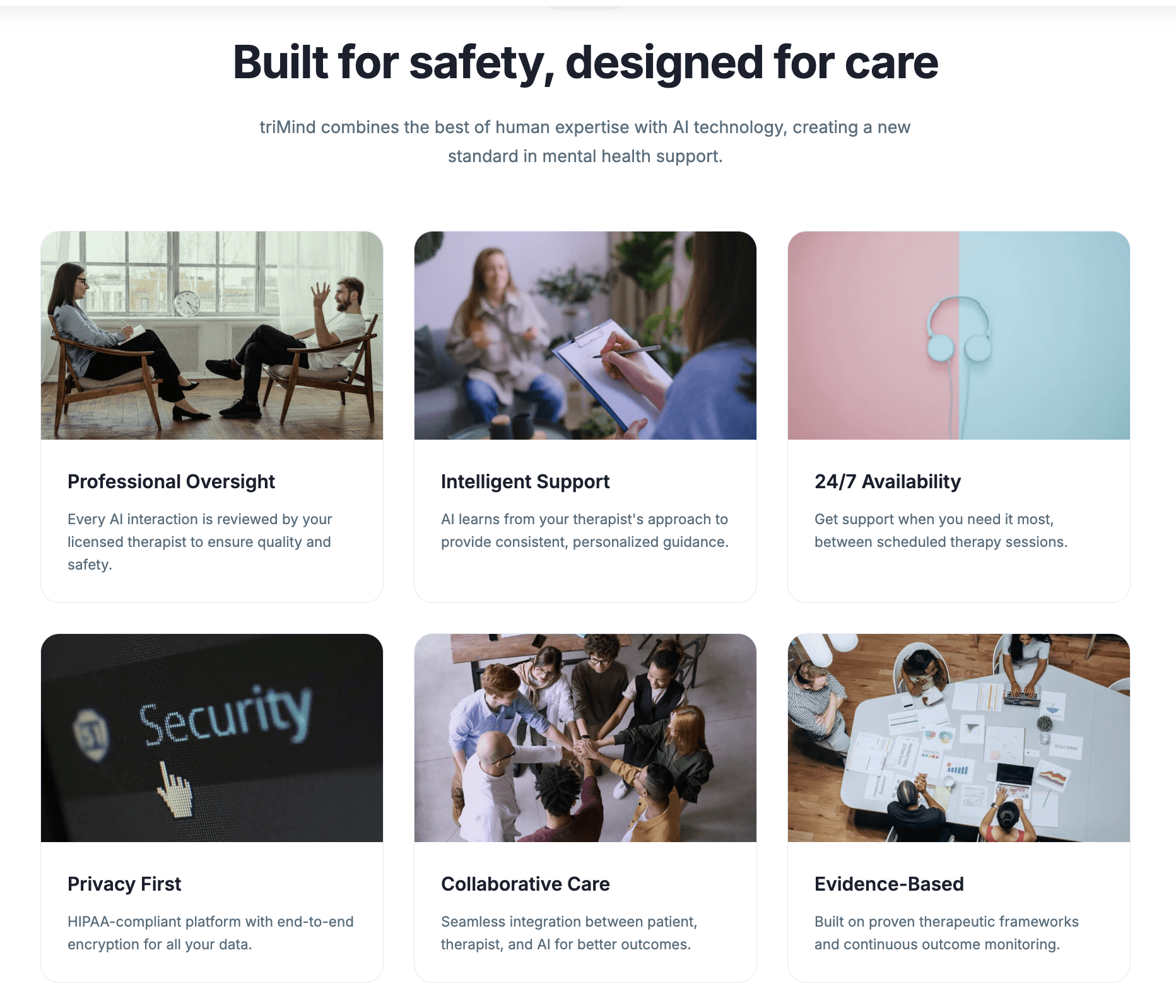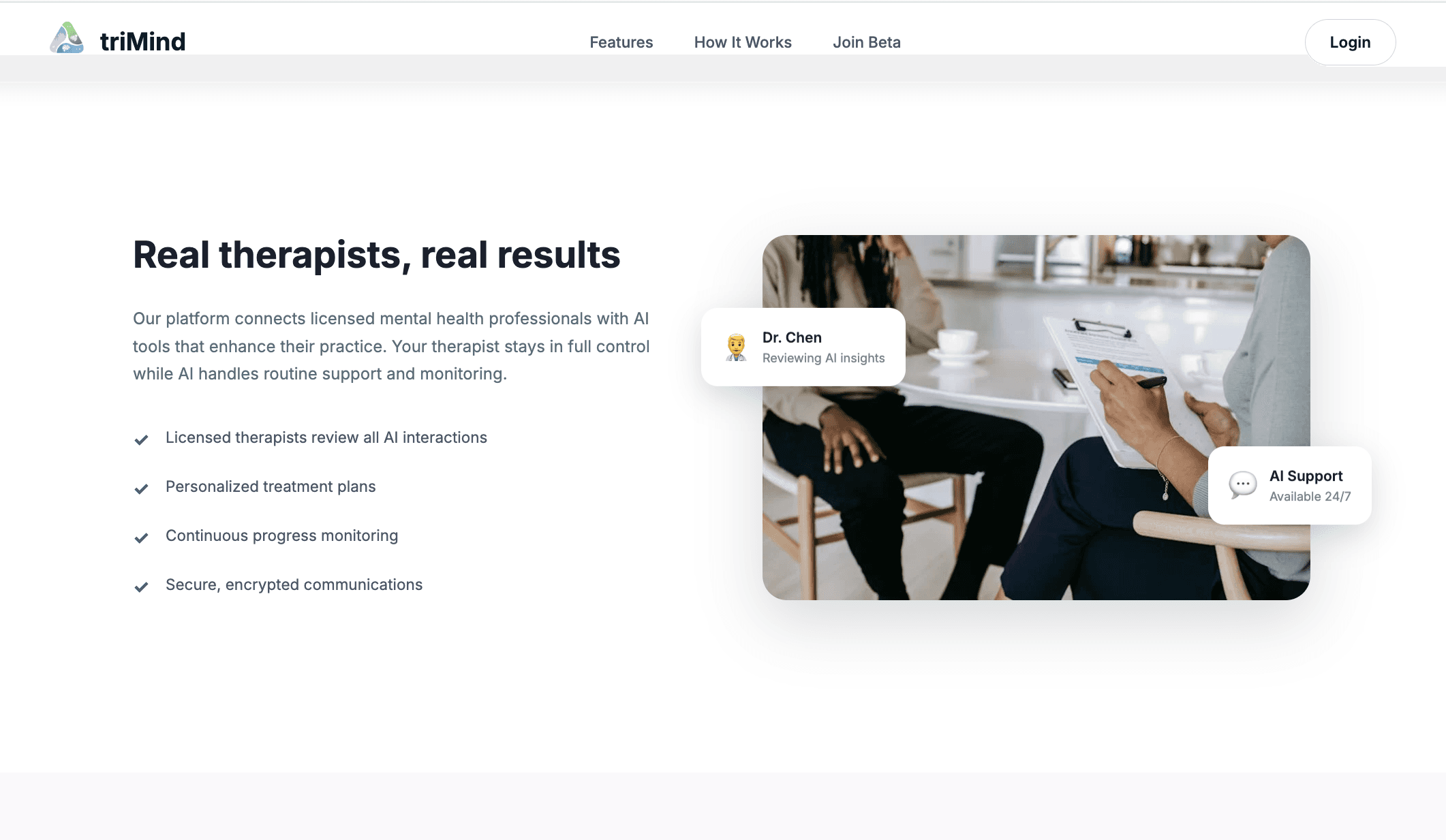 The inspiration also came from common therapist pain points: admin overload, note-taking, intake fatigue, and patient follow-up. TriMind tests how AI can help with that while keeping the clinical voice safe and supervised.